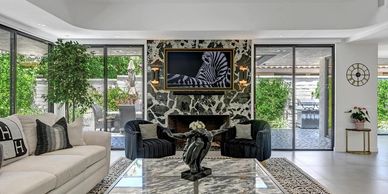 Our first signature transformation in Palm Springs, The Palomino reimagined a spacious mid-century villa into a statement of Hollywood Regency meets Modernist chic. Every room was layered with visual interest — from bold, custom wallpaper installations to bespoke lighting and sleek flooring. The kitchen was fully rebuilt for entertaining, and the entire 2,205 sq ft layout was enhanced with clean lines, curated finishes, and design-forward flair. A blend of vintage soul and modern polish, this home helped define our early aesthetic: luxurious, livable, and a little theatrical.